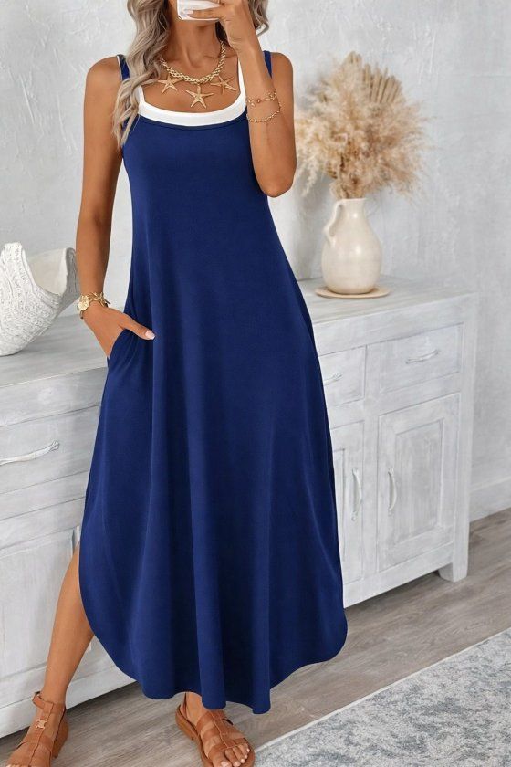 Kadın Ip Askılı Yuvarlak Yakalı Cepli Uzun Viskon Elbise