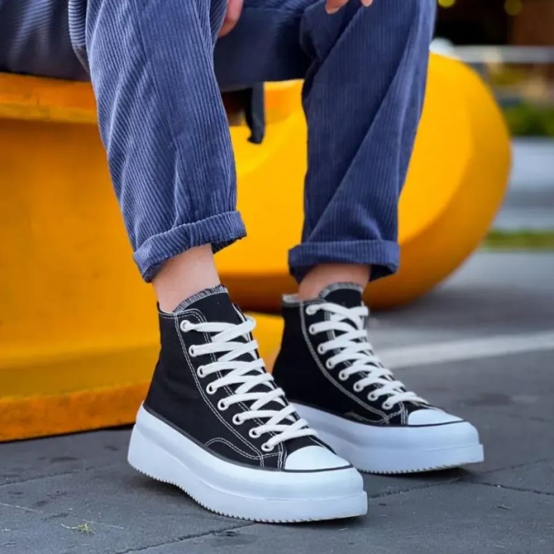 Klasik yüksek bilekli kanvas ruhunu, modern ve iddialı bir yüksek tabanla yeniden yorumladık! KB-CX-3 Kuback, siyah ketenin zamansız şıklığını kontrast beyaz tabanla birleştirerek sokak stiline yeni bir soluk getiriyor. Hem konforlu yapısı hem de dikkat çekici silüetiyle her adımda fark edilmek isteyenler için tasarlandı.