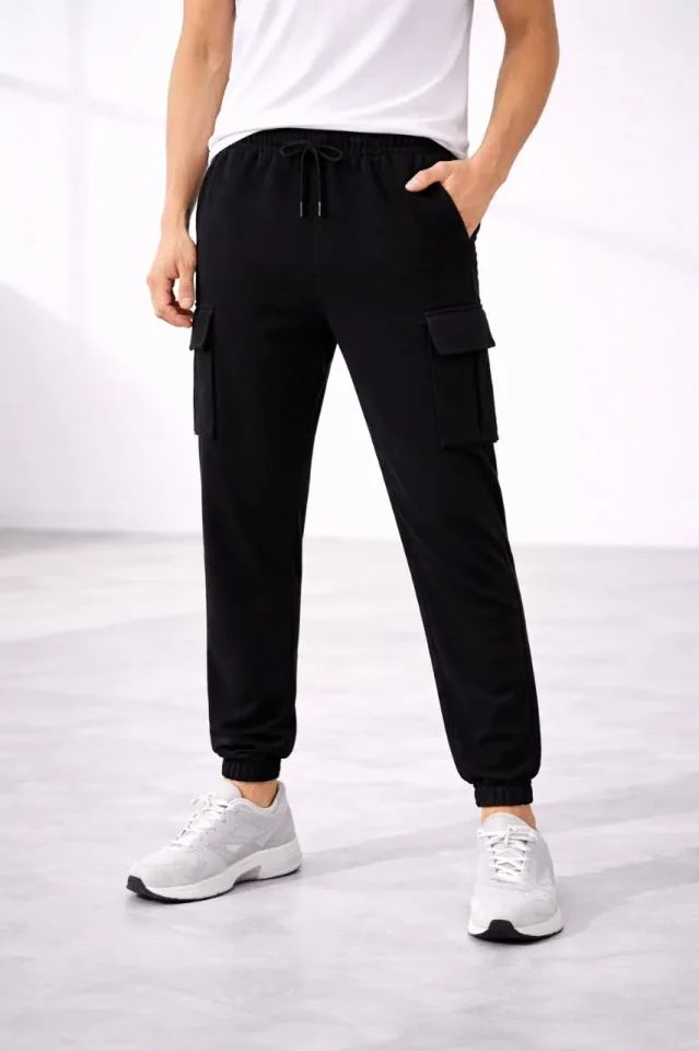 Erkek Jogger Eşofman Altı Regular Fit , Kargo Cepli, Lastikli Paça, Günlük Spor Pantolon - Siyah