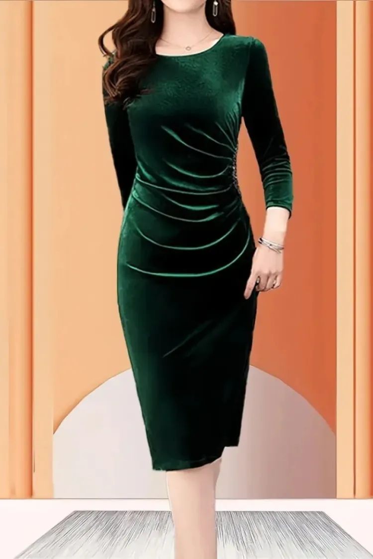 Kadın Uzun Kollu Yakası Açık Yanlardan Büzgülü Taş Detaylı Midi Kadife Elbise