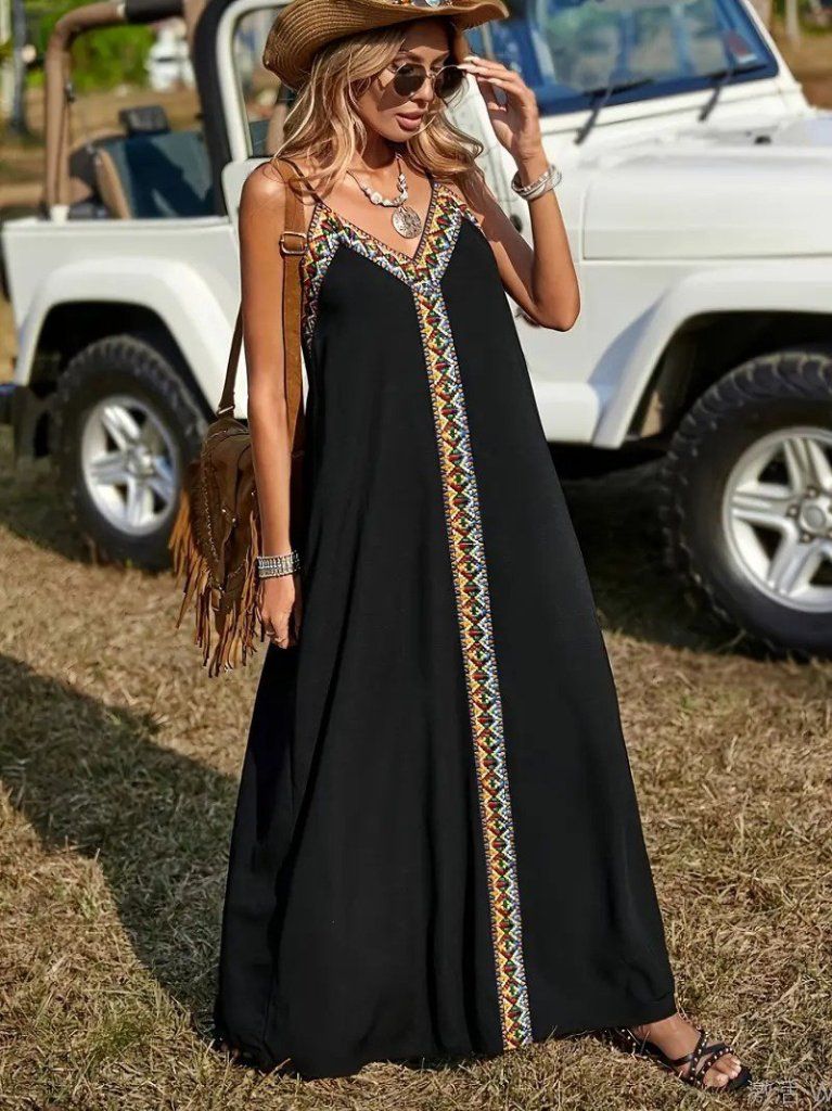 Kadın Askılı V Yakalı Etnik şerit Detaylı Uzun Viskon Elbise