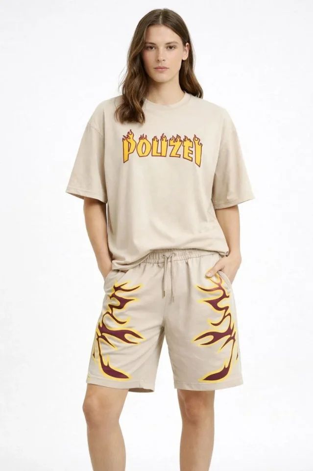 Bej Oversize Baskılı Tişört Şort Takım Cepli Şort Yazlık Rahat Günlük Kombin - Bej
