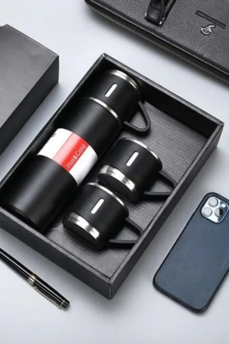 3’lü Fincan Takımlı Paslanmaz Çelik Termos Seti - 500 ml Siyah