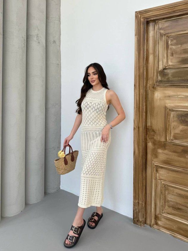 Kadın Kolsuz Kuş Gözü Teday Full Transparan Maxi Boy Elbise