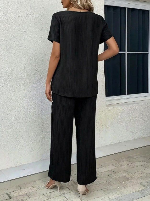 Kadın Kısa Kollu Bisiklet Yaka Asimetrik Kesim Detaylı Bürümcük Bluz Ve Pantolon Ikili Takım