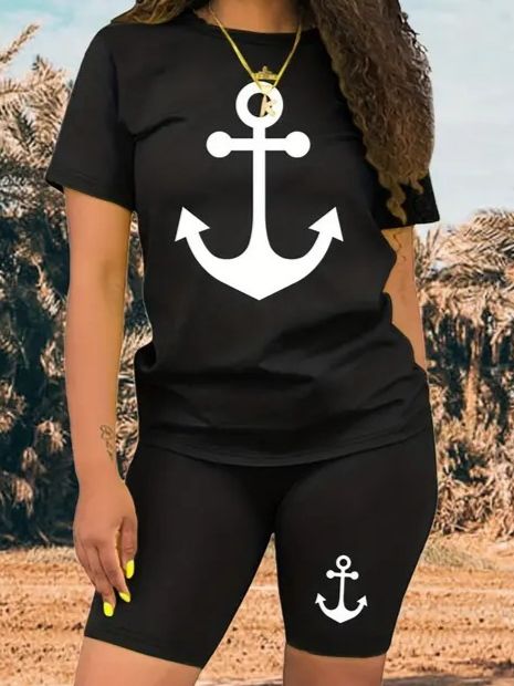 Kadın Kısa Kollu çapa Baskılı Viskon Ikili Takım
