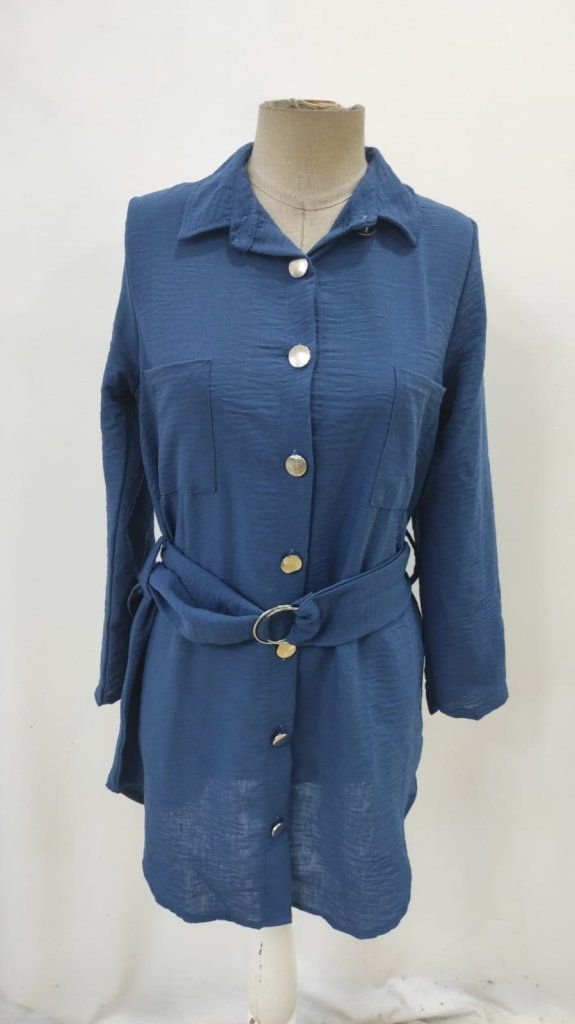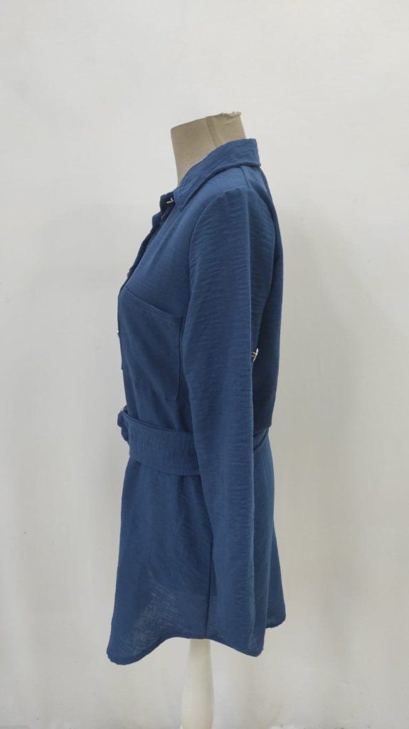 Kadın Uzun Kollu Yakalı önden Düğmeli Beli Kuşaklı Mini Ithal Keten Elbise