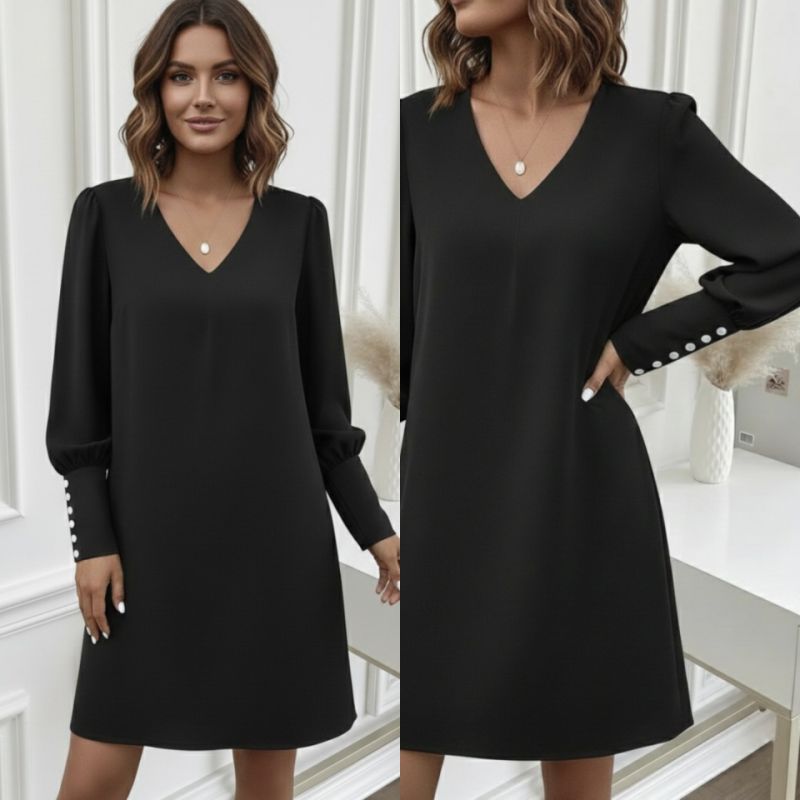 Kadın Uzun Kollu V Yakalı Kısa Ithal Krep Elbise