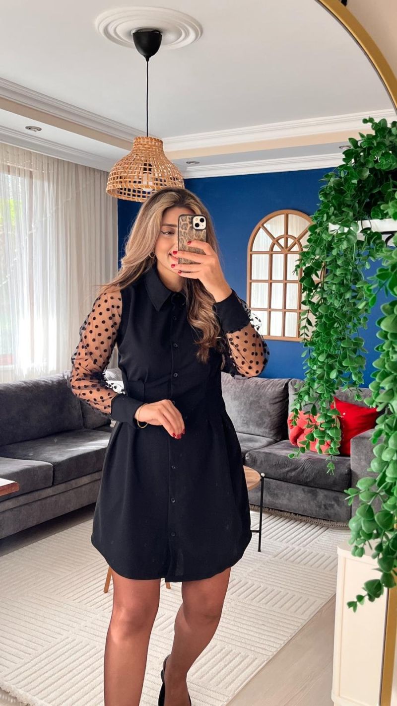 Kadın Uzun Kollu Yakalı Düğmeli Mini Ithal Krep Elbise