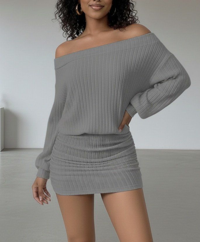 Kadın Uzun Kollu Madonna Yaka Yanlardan Büzgülü şardonlu Kaşkorse Mini Elbise