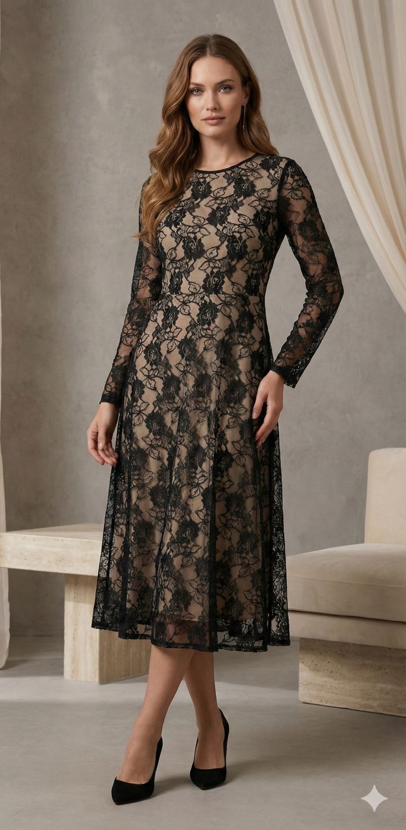 Kadın Uzun Kollu Bisiklet Yaka Dantelli Astarlı Midi Elbise