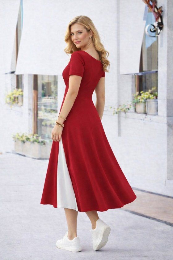 Kadın Kısa Kollu Asimetrik Yakalı Düğme Detaylı Midi Viskon Elbise