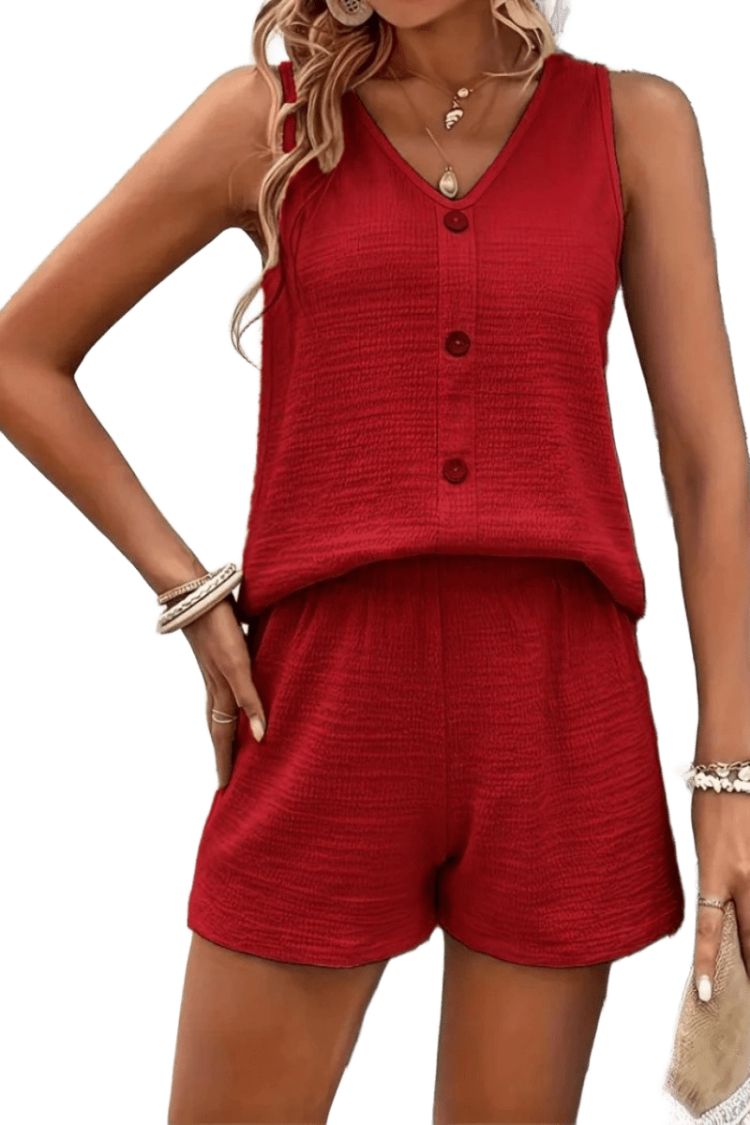 Kadın Askılı Kolsuz V Yakalı Önden Düğmeli Bürümcük Bluz ve Şort İkili Takım