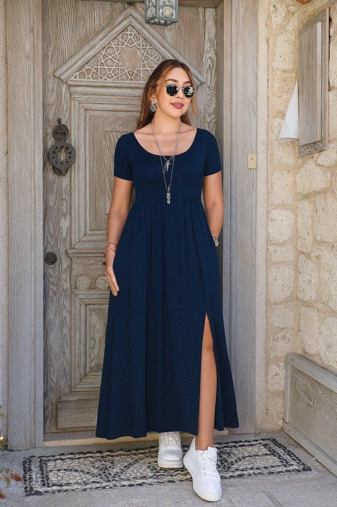 Kadın Kısa Kollu Yuvarlak Yaka önden Yırtmaçlı Cepli Viskon Uzun Elbise