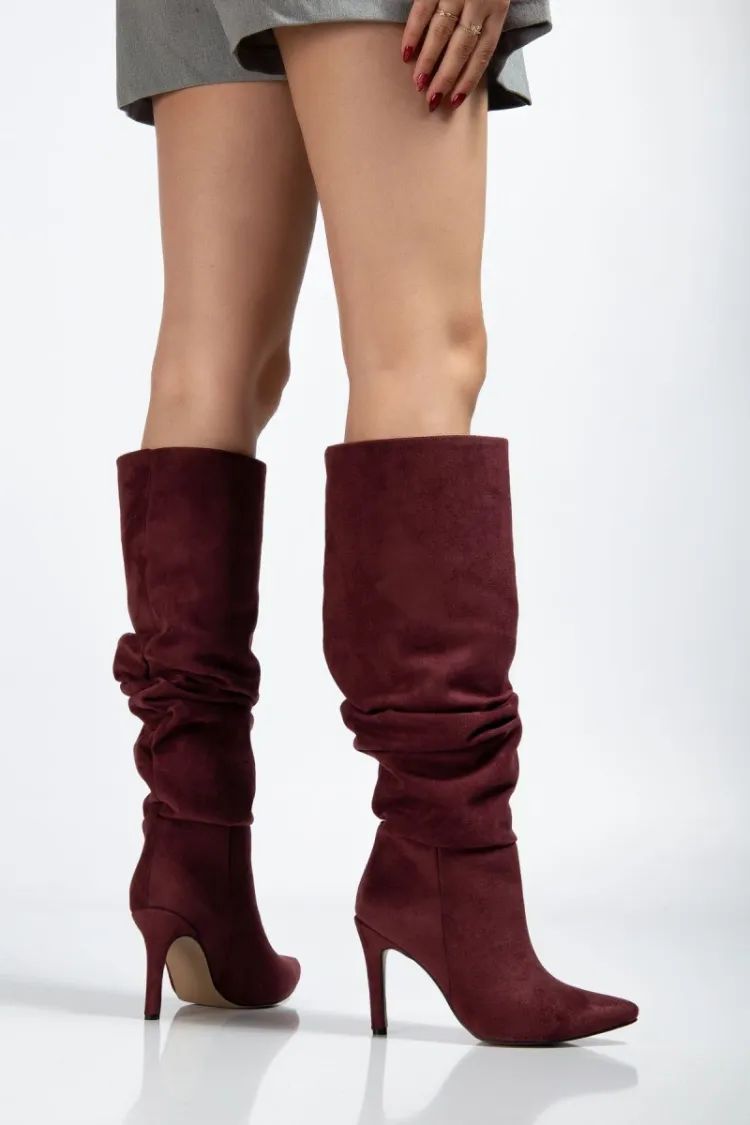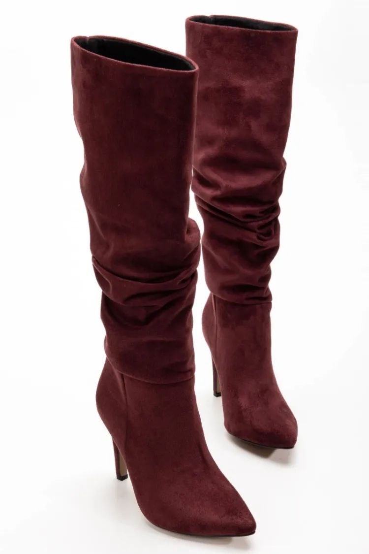 Bordo Süet Körüklü İnce Topuklu Günlük Bayan Çizme