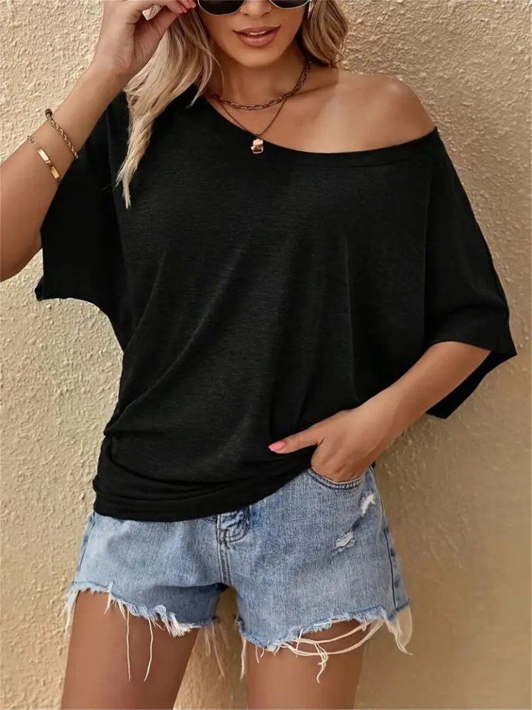 Kadın Tek Omuzu Açık Kısa Kollu Salaş Viskon Bluz