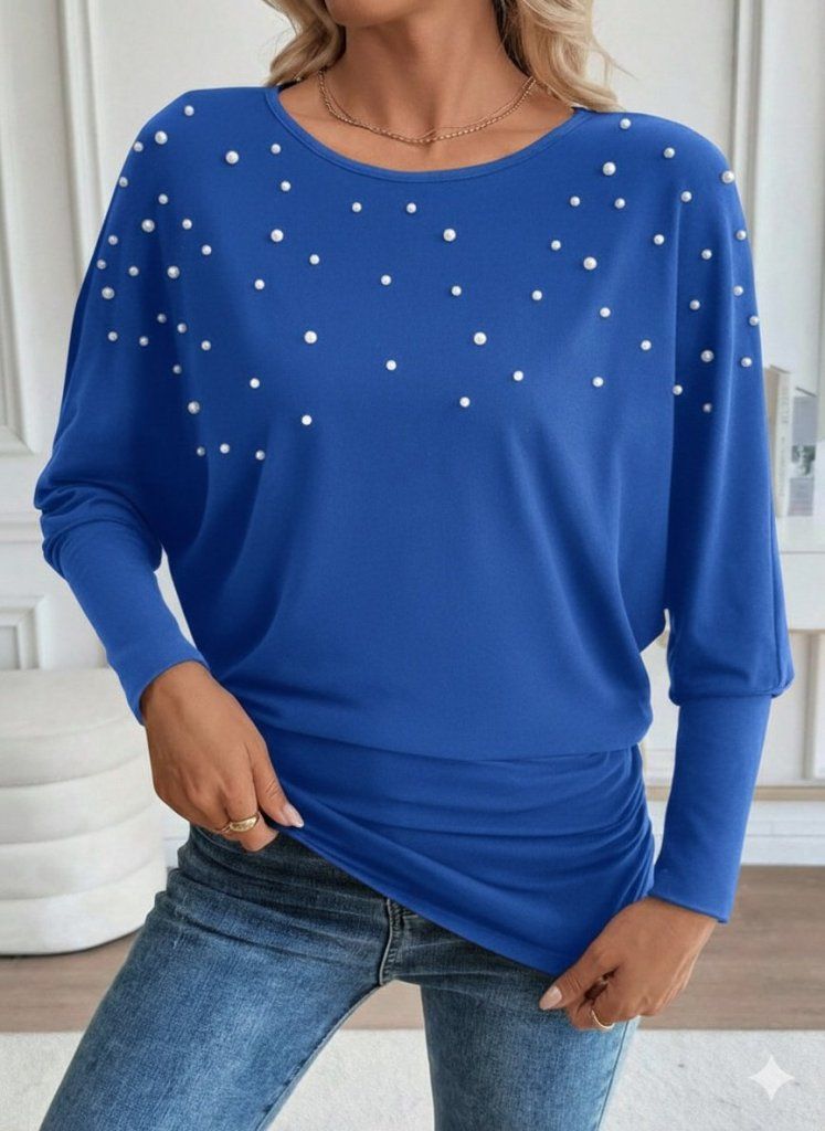 Kadın Uzun Kollu Yuvarlak Yaka Incili Viskon Bluz