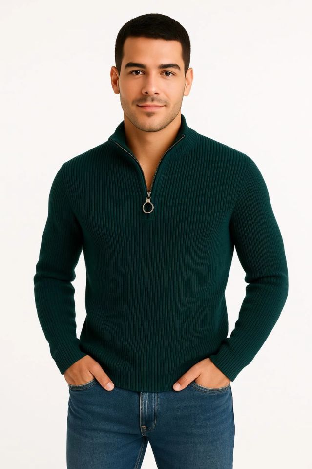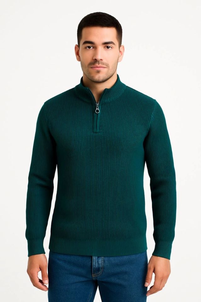 Erkek Yarım Fermuarlı Triko Kazak – Selanik Örgü, Dik Yaka, Pamuklu Dokuma, Regular Fit Uzun Kollu Kışlık Model - Haki
