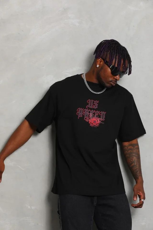 Erkek Baskılı Tişort Kısa Kol Bisiklet Yaka Ovarsize T-Shirt - Siyah
