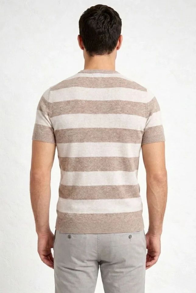 Erkek T-shirt Çizgili Triko Dokuma Bisiklet Yaka Tişört - Bej