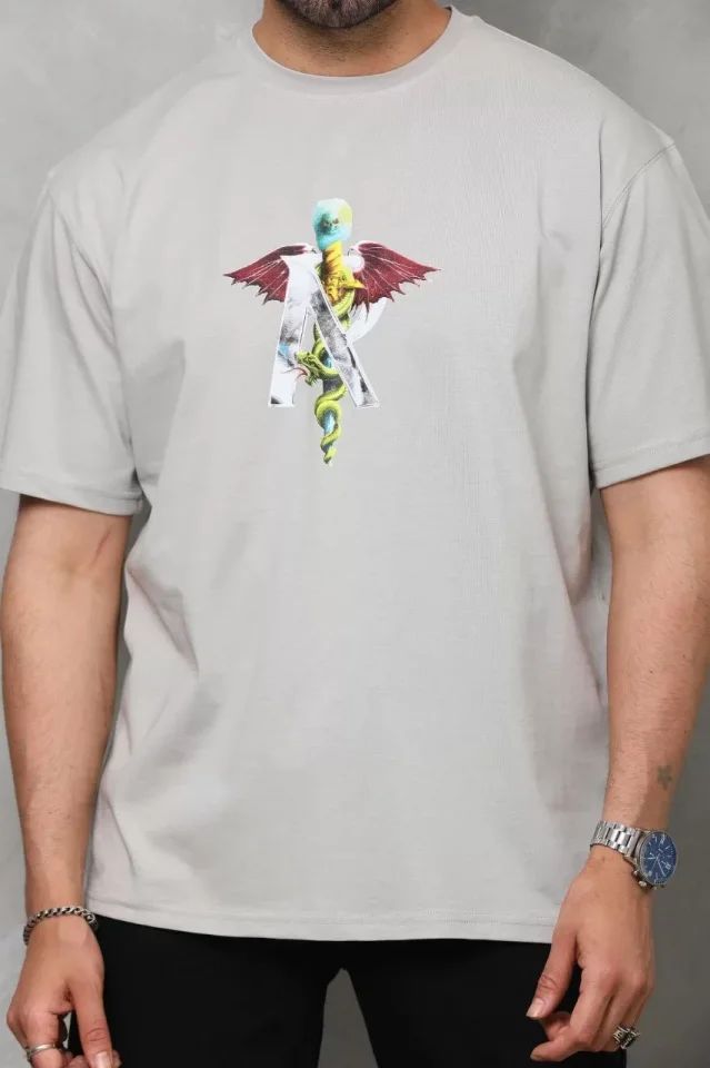 Unisex Bisiklet Yaka Baskılı Oversize T-Shirt - Gri