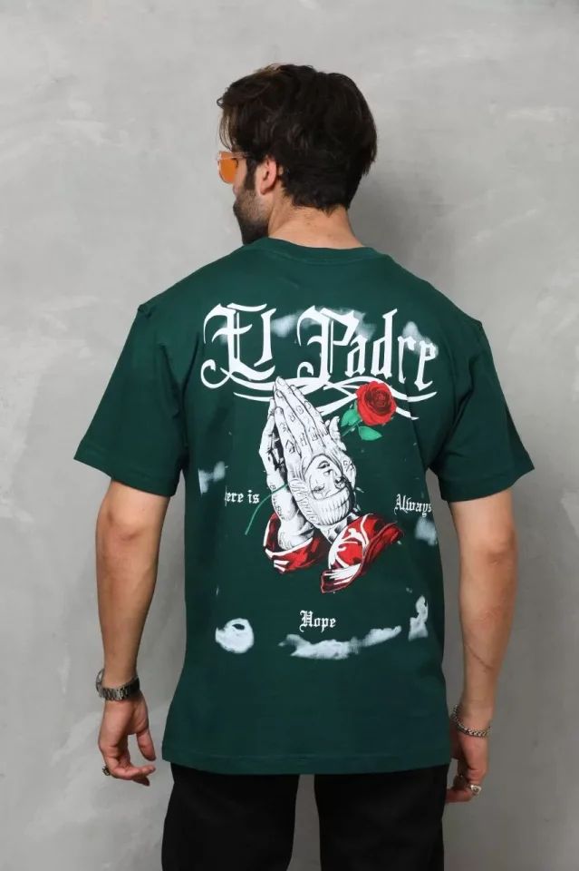 Unisex Bisiklet Yaka Baskılı Oversize T-Shirt - Yeşil