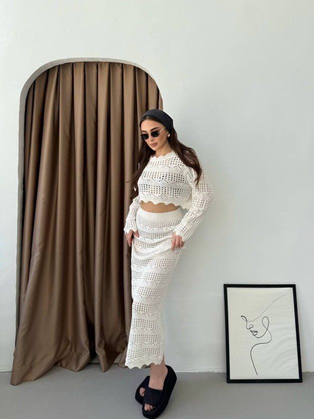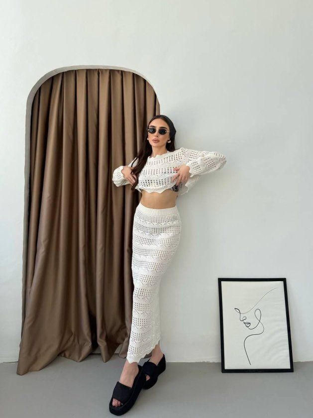 Kadın Uzun Kollu Kuş Gözü Transparan Detay Triko Bluz Ve Maxi Boy Etek Ikili Takım