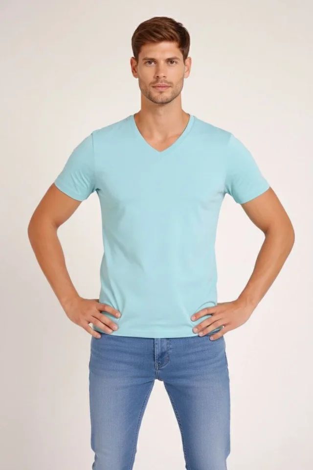 Erkek T-Shirt V Yaka Slim Fit Dar Kesim Likralı Tişört Günlük Basic Body - Turkuvaz