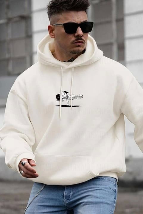 Erkek Baskılı Kapüşonlu Ve Kordon İpli Sweat - Beyaz