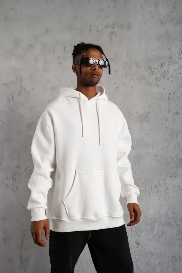 Erkek Düz Kapüşonlu Sweat - Beyaz