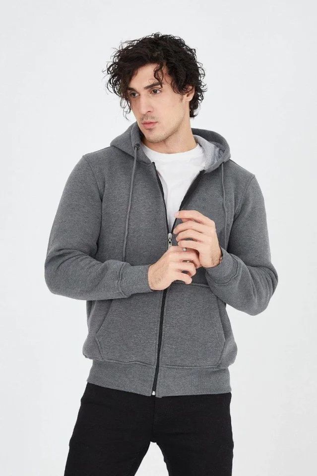 Erkek Kapüşonlu Düz Fermuarlı Hırka - Füme