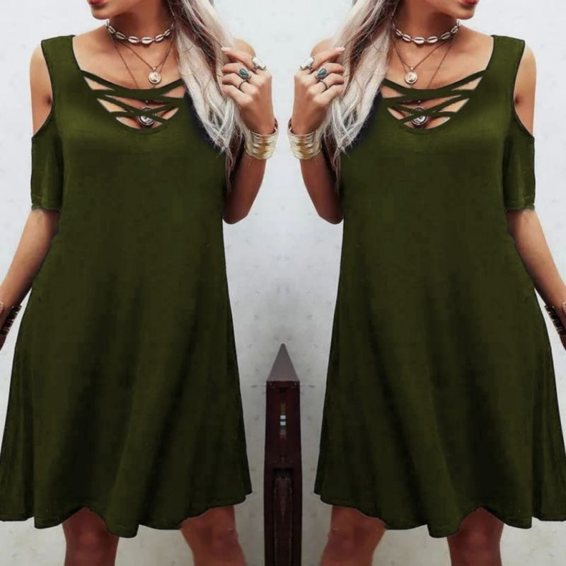 Dekolteli Bağcık Detay Viskon Kumaş Elbise