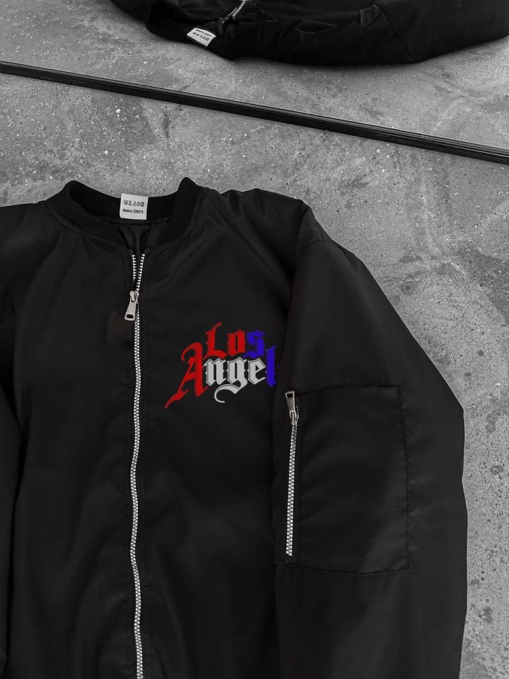 Tam Fermuarlı Uzun Kol Baskılı Bomber Ceket - Siyah