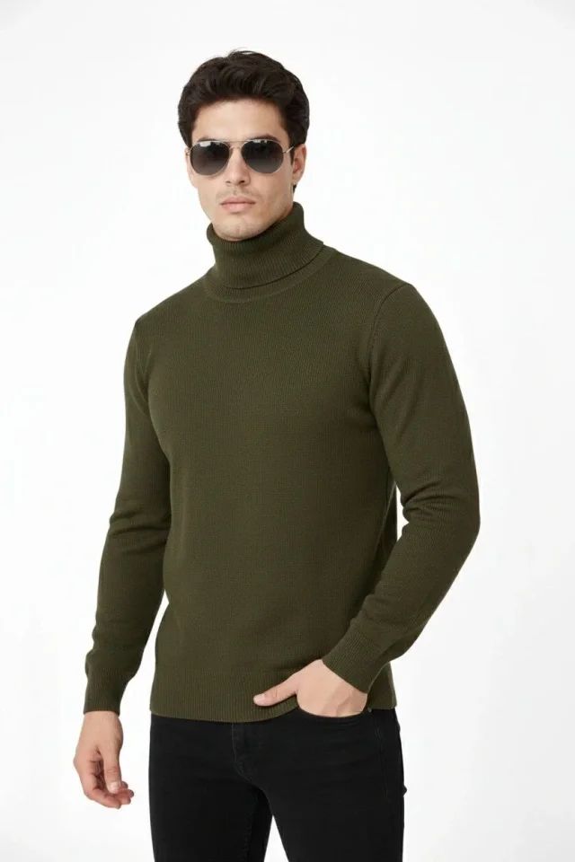 Tam Boğazlı Balıkcı Yaka Triko Kazak Yumuşak Dokulu Pamuklu Ince Dokuma, Uzun Kollu Rahat Regular Kalıp - Haki