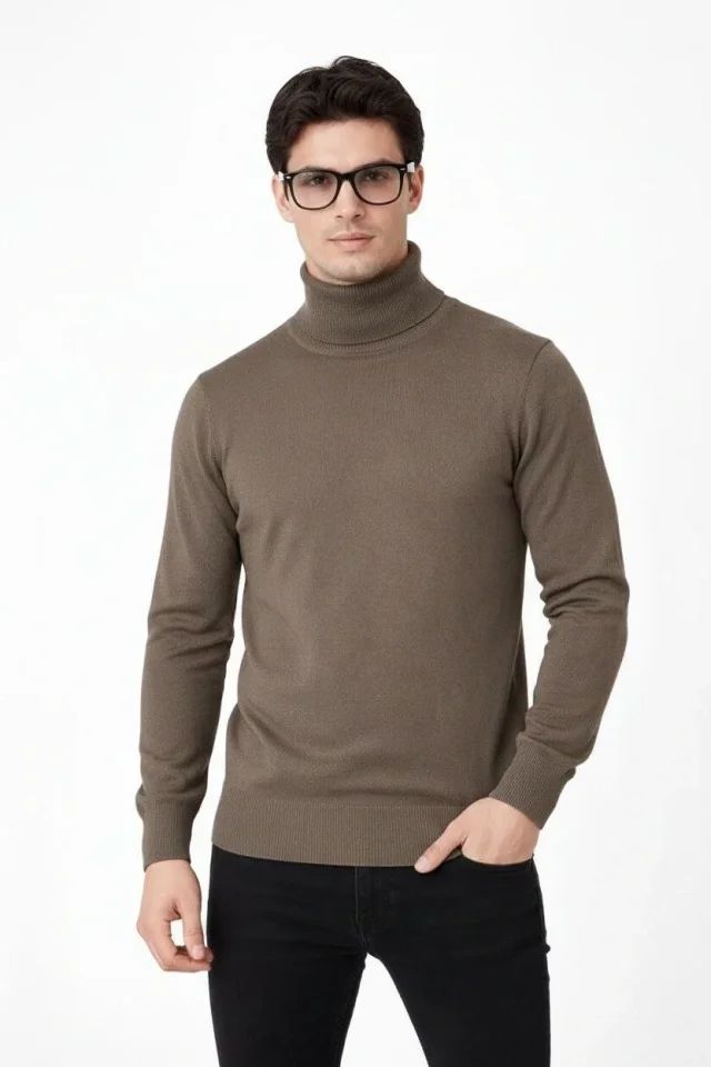 Tam Boğazlı Balıkcı Yaka Triko Kazak Yumuşak Dokulu Pamuklu Ince Dokuma, Uzun Kollu Rahat Regular Kalıp - Kahverengi
