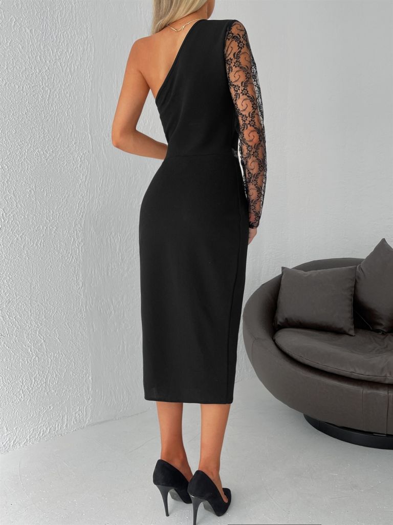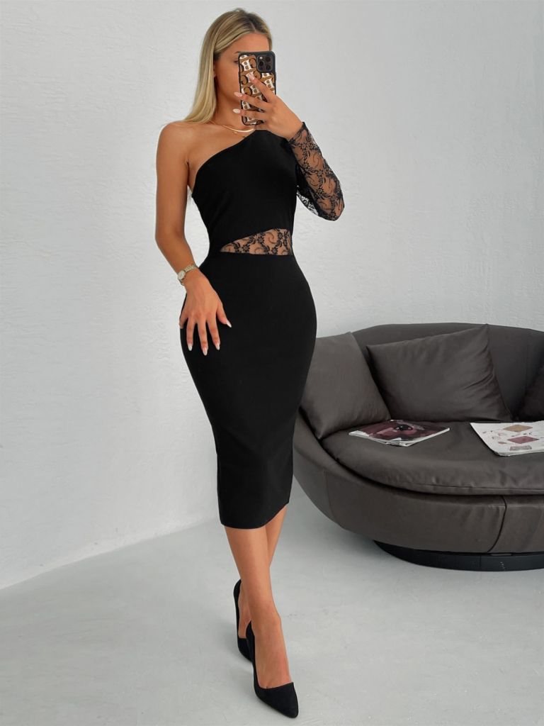 Kadın Siyah Tek Kol Dantel Detay Omuz Dekolte Krep Elbise