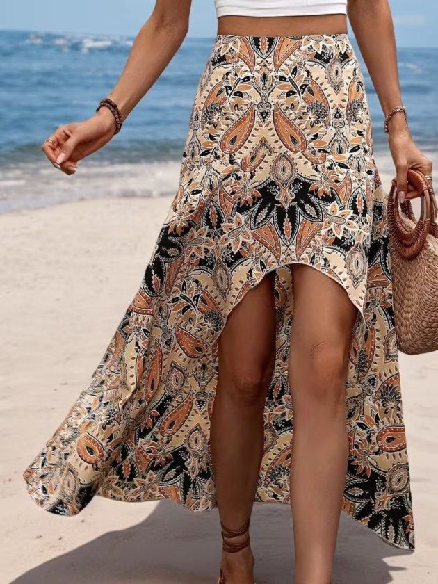 Kadın Yüksek Bel çiçek Desenli önü Asimetrik Detaylı Uzun Süprem Etek