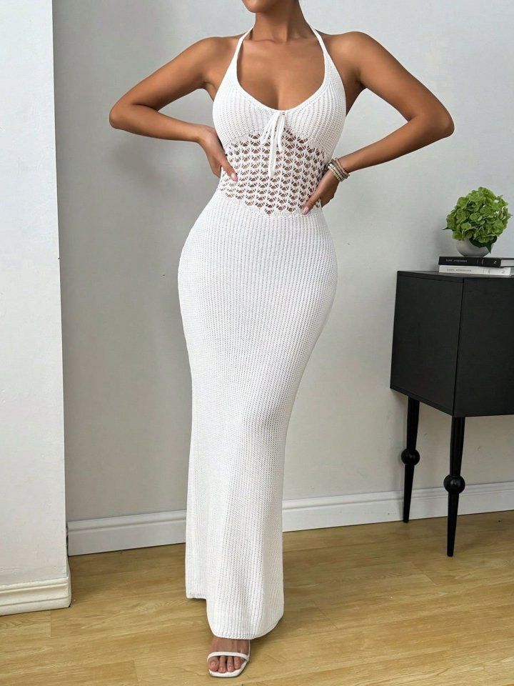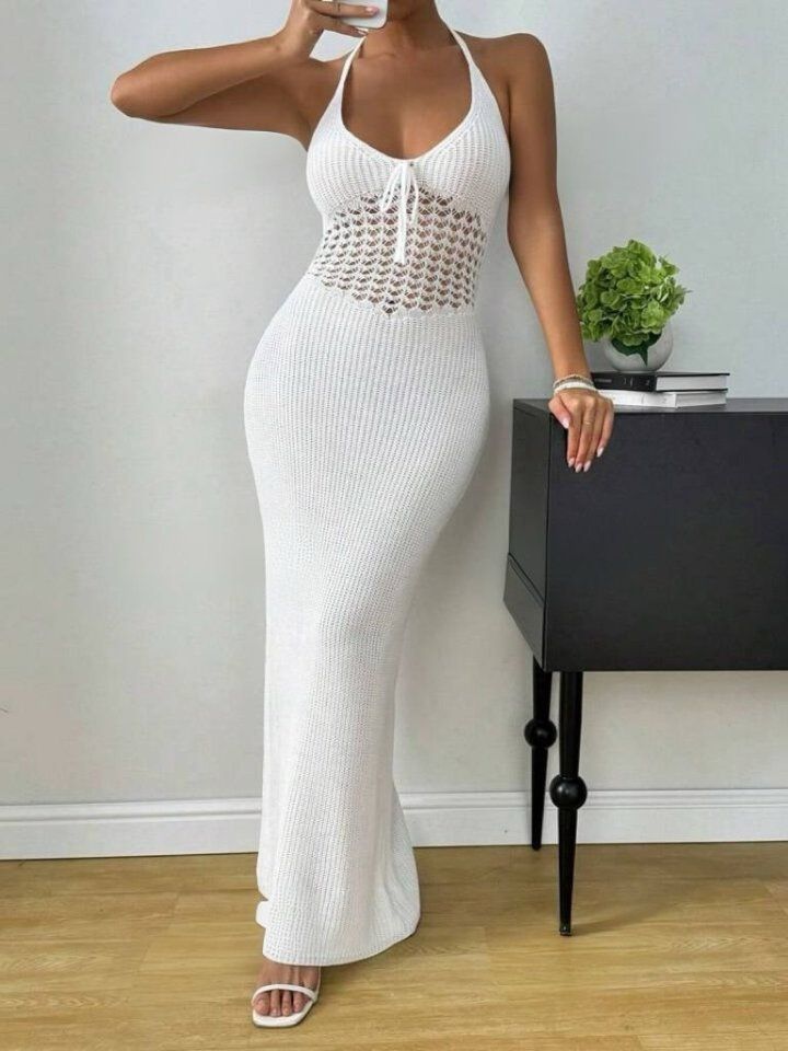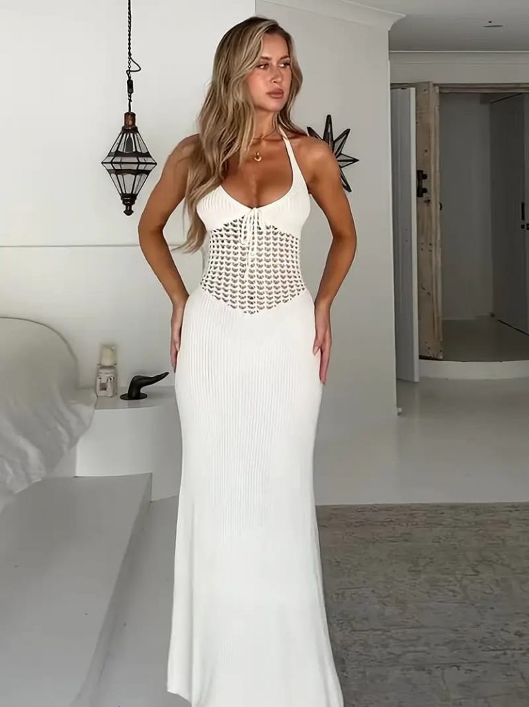 Kadın Boyundan Ve Sırttan Bağlamalı Dekolteli Triko Uzun Elbise
