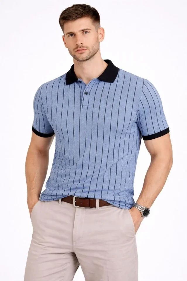 Erkek Polo Yaka Çizgili Tişört Kısa Kol Düğmeli Yazlık T-Shirt - Bebek Mavisi