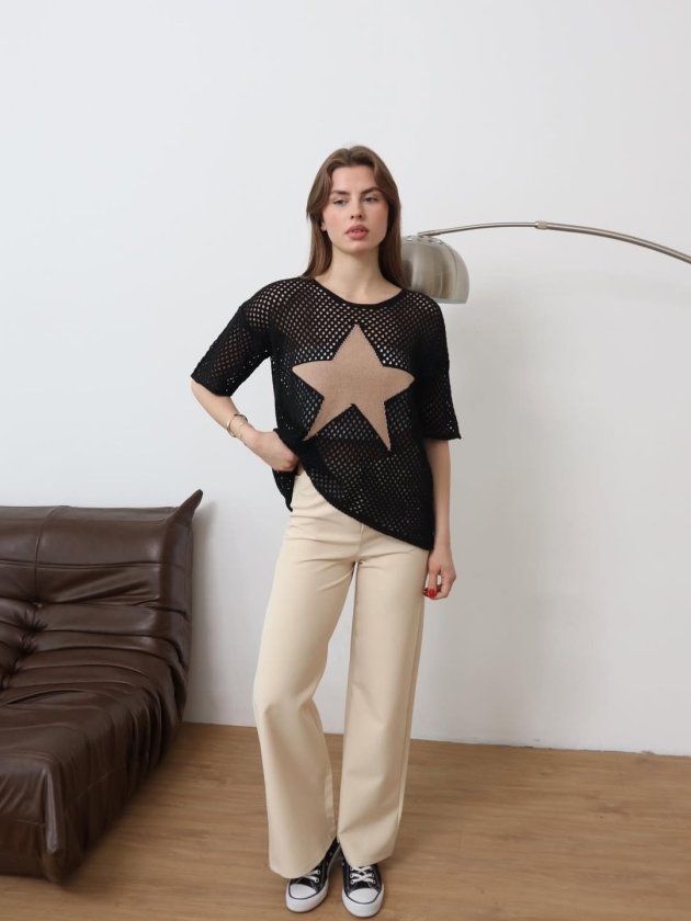 Kadın önü Yıldız Desenli File Triko Bluz