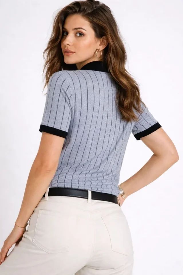 Polo Yaka Çizgili Tişört Kısa Kol Düğmeli Yazlık T-Shirt - Bebek Mavisi