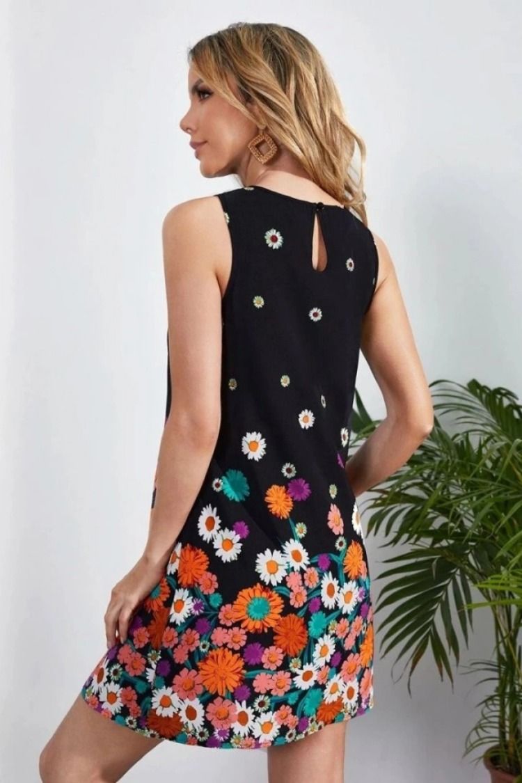 Kadın Sıfır Kollu Bisiklet Yaka Çiçek Desenli Süprem Mini Elbise