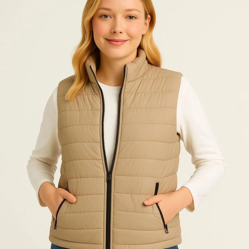 Şişme Fermuarlı Yelek Su Itici Kapitone Astarlı Kumaş Cepli Hafif Kışlık Spor Rahat Kalıp - Bej