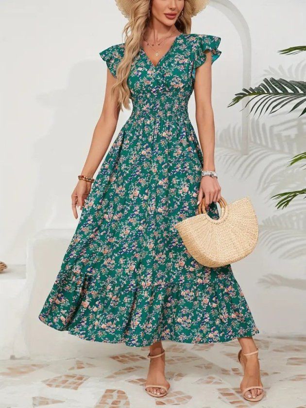 Kadın Kısa Kollu Kruvaze Yaka Beli Lastikli çiçek Desenli Elbise