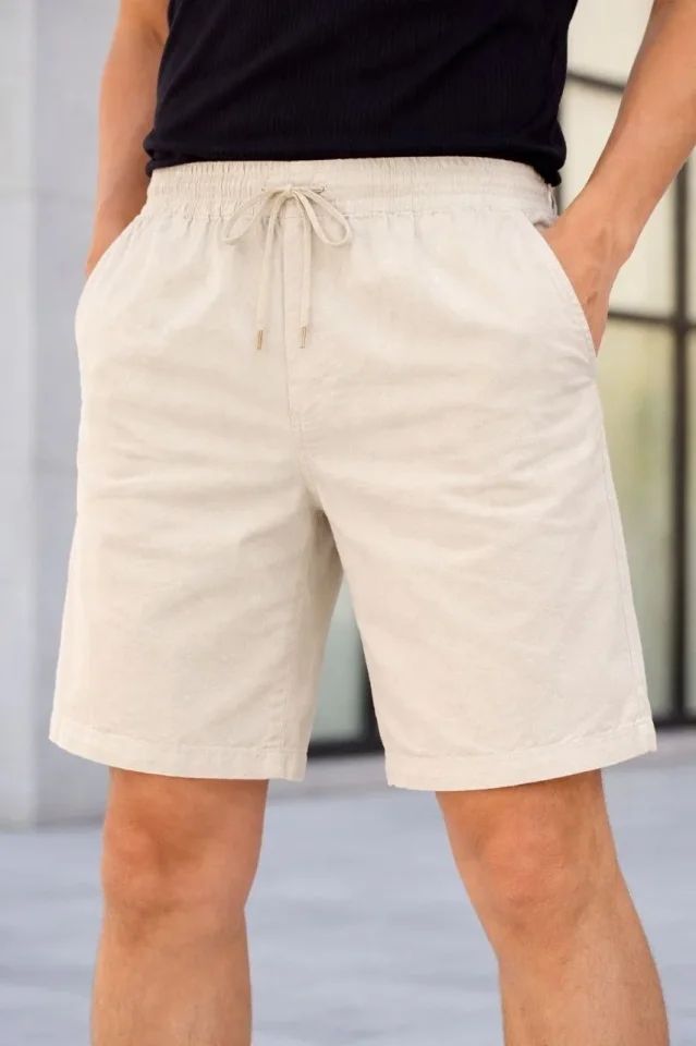 Erkek Keten Kumaş Cepli Rahat Kesim Bel Lastikli Şort - Krem