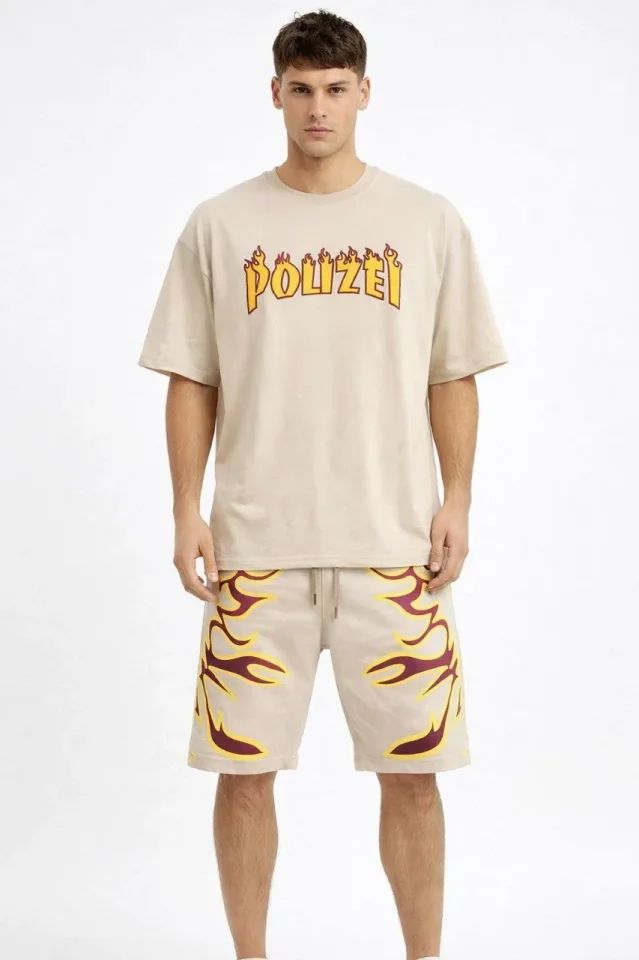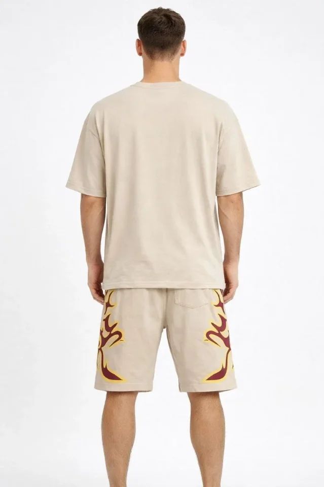 Erkek Bej Oversize Baskılı Tişört Şort Takım Cepli Şort Yazlık Rahat Günlük Kombin - Bej