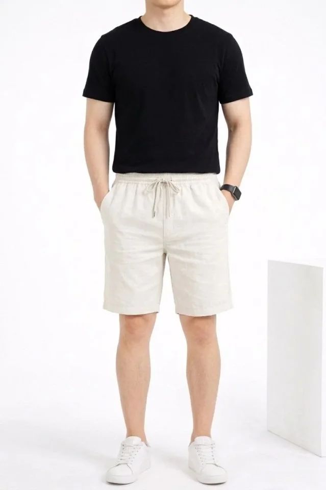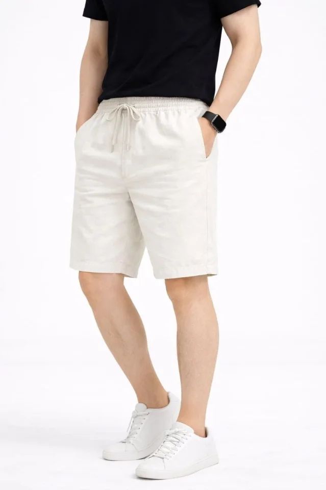 Erkek Keten Kumaş Cepli Rahat Kesim Bel Lastikli Şort - Beyaz