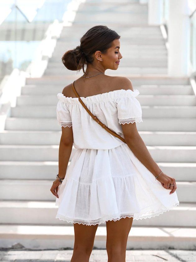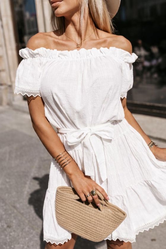 Kadın Dantel Detaylı Madonna Yaka Beli Kuşaklı Keten Kumaş Elbise