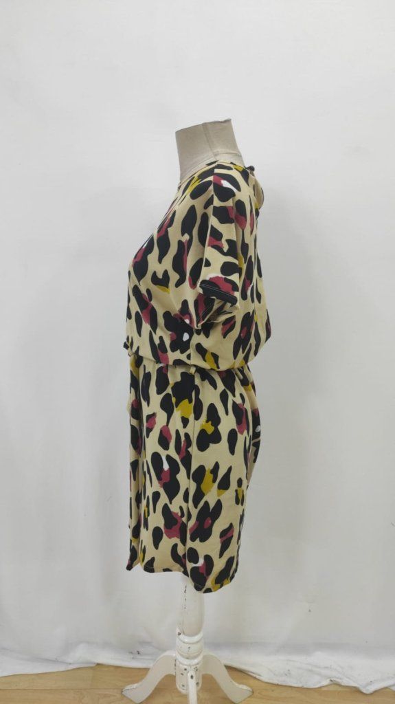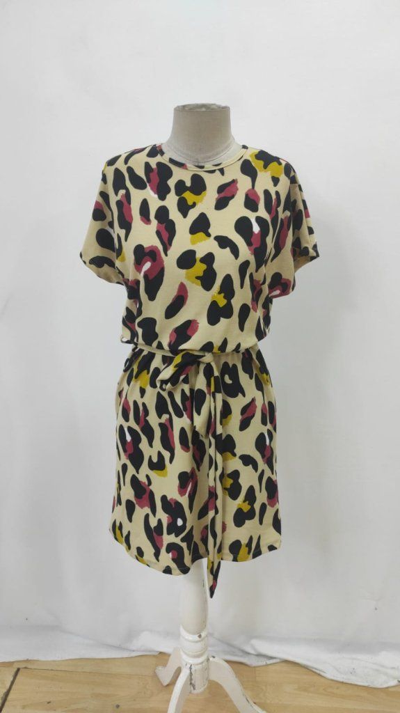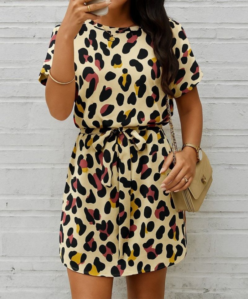 Kadın Kısa Kollu Yuvarlak Yaka Beli Kuşaklı Geometrik Desenli Süprem Elbise