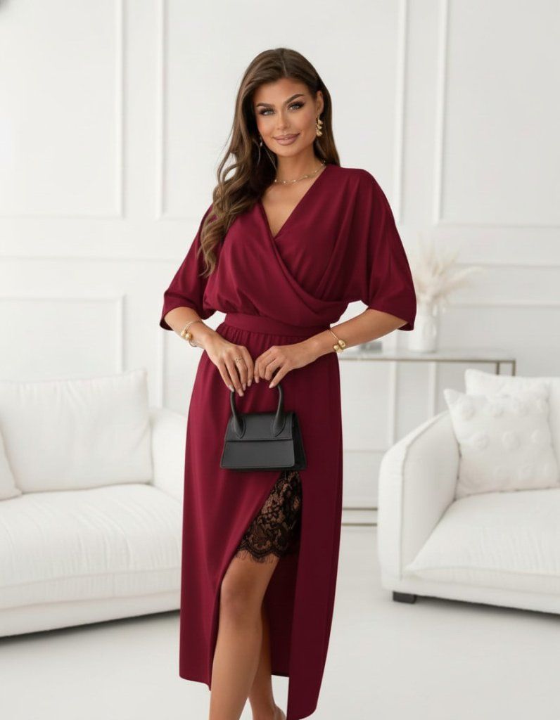 Kadın Uzun Kollu Kruvaze Yakalı Yandan Dantelli Midi Ithal Krep Elbise